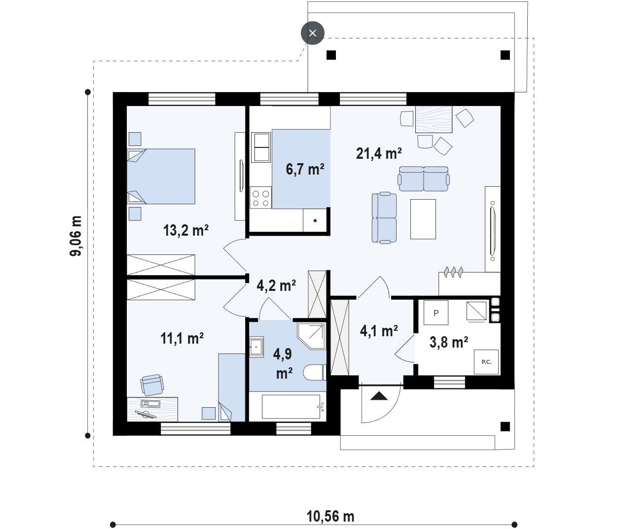 Z78 to kompaktowy i ekonomiczny dom parterowy o powierzchni użytkowej 65,6 m², zaprojektowany z myślą o osobach ceniących komfort, prostotę i nowoczesne rozwiązania. Prosta bryła z dachem dwuspadowym sprawia, że budynek jest tani w budowie i eksploatacji, a jednocześnie prezentuje się wyjątkowo elegancko. To idealny projekt dla par, seniorów lub niewielkich rodzin, szukających niedrogiego domu całorocznego lub letniskowego.