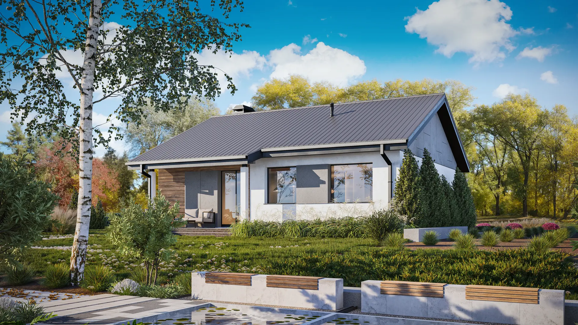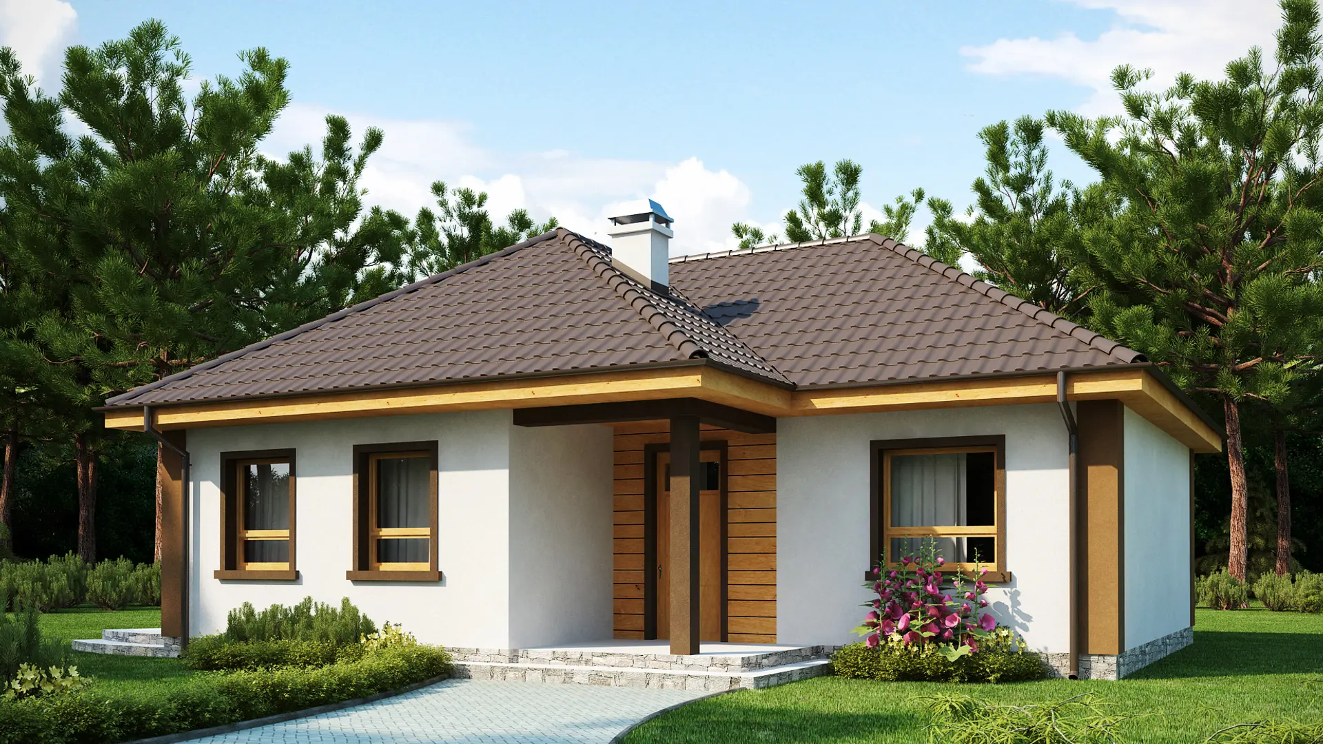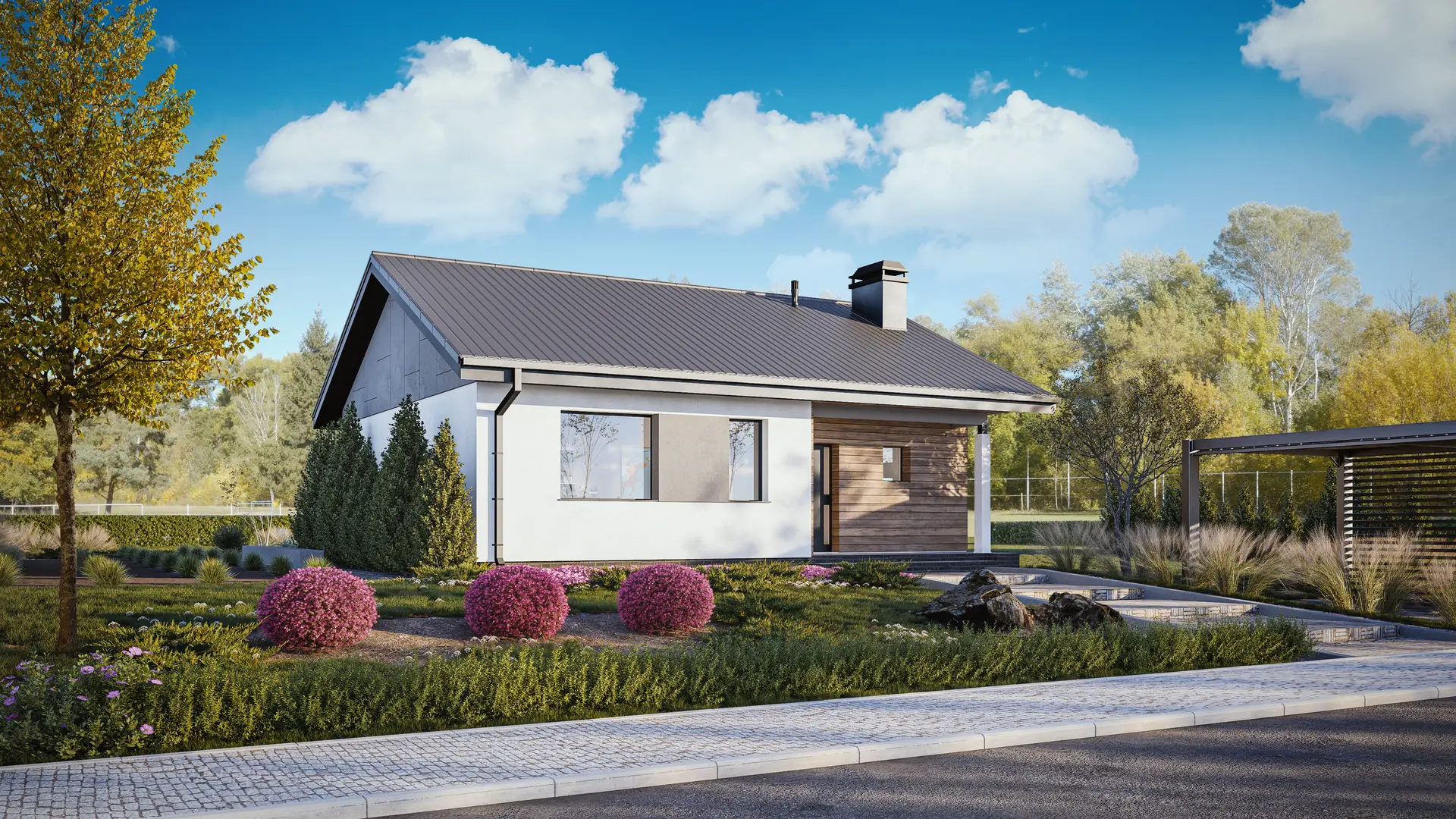 Projekt domu Z78 to tani w budowie, murowany dom parterowy do 70 m², łączący nowoczesny wygląd, funkcjonalny układ wnętrz i energooszczędne rozwiązania. Idealny dla osób, które szukają niedrogiego, prostego w realizacji domu na małą działkę, zapewniającego komfort i niskie koszty utrzymania.