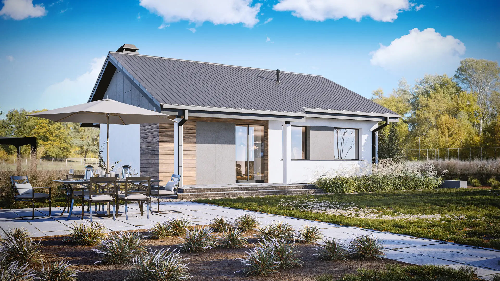 Połączenie jasnych tynków z drewnopodobnymi akcentami nadaje mu przytulności i wpisuje się w aktualne trendy architektury domów jednorodzinnych.