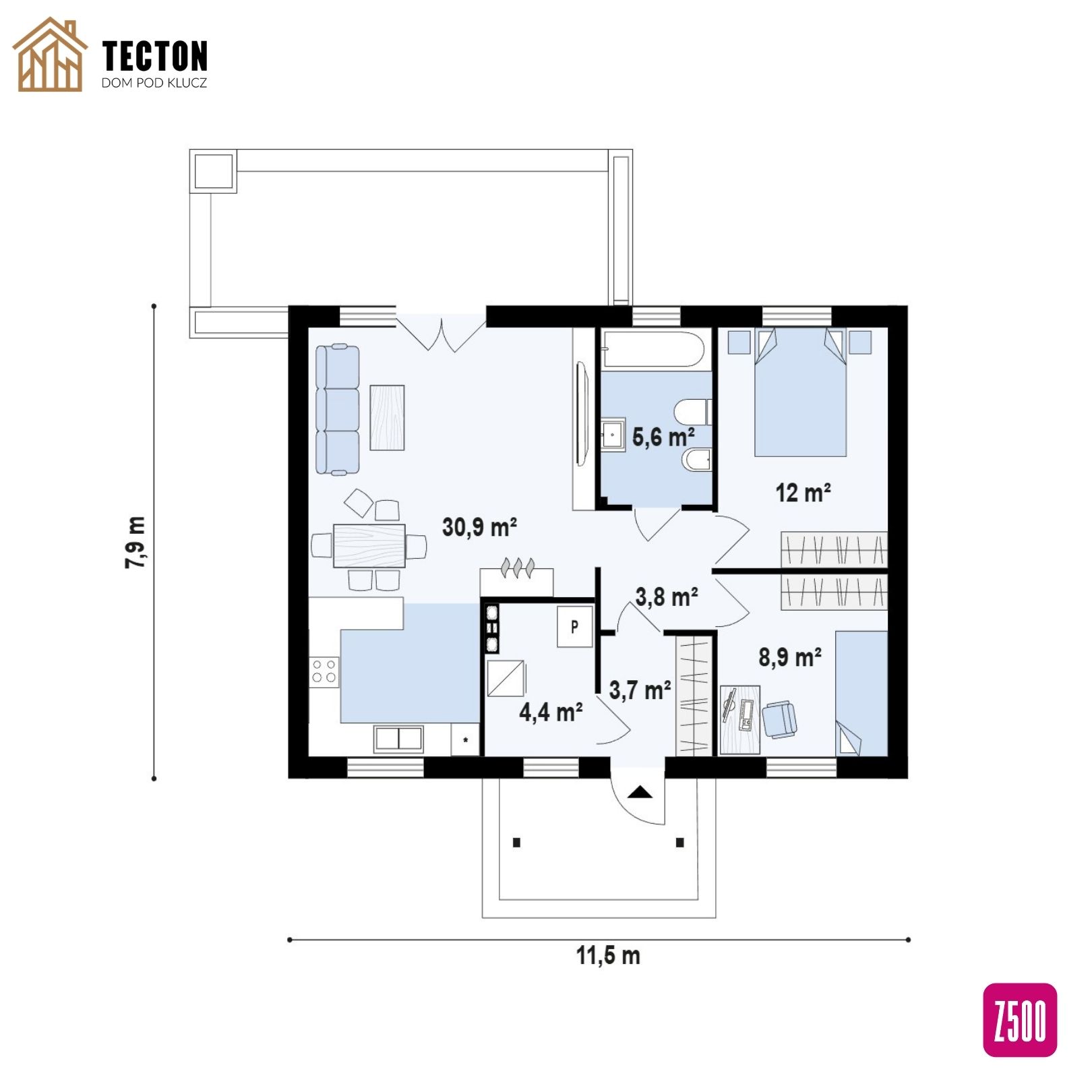 Dom Z12 to niewielki, murowany dom parterowy, który łączy w sobie prostotę konstrukcji, niskie koszty budowy i pełną funkcjonalność dla małej rodziny. Dzięki powierzchni użytkowej 64,9 m² i możliwości etapowania inwestycji, projekt Z12 stanowi idealne rozwiązanie dla osób szukających taniego domu do 70 m², który można łatwo dopasować do własnych potrzeb.