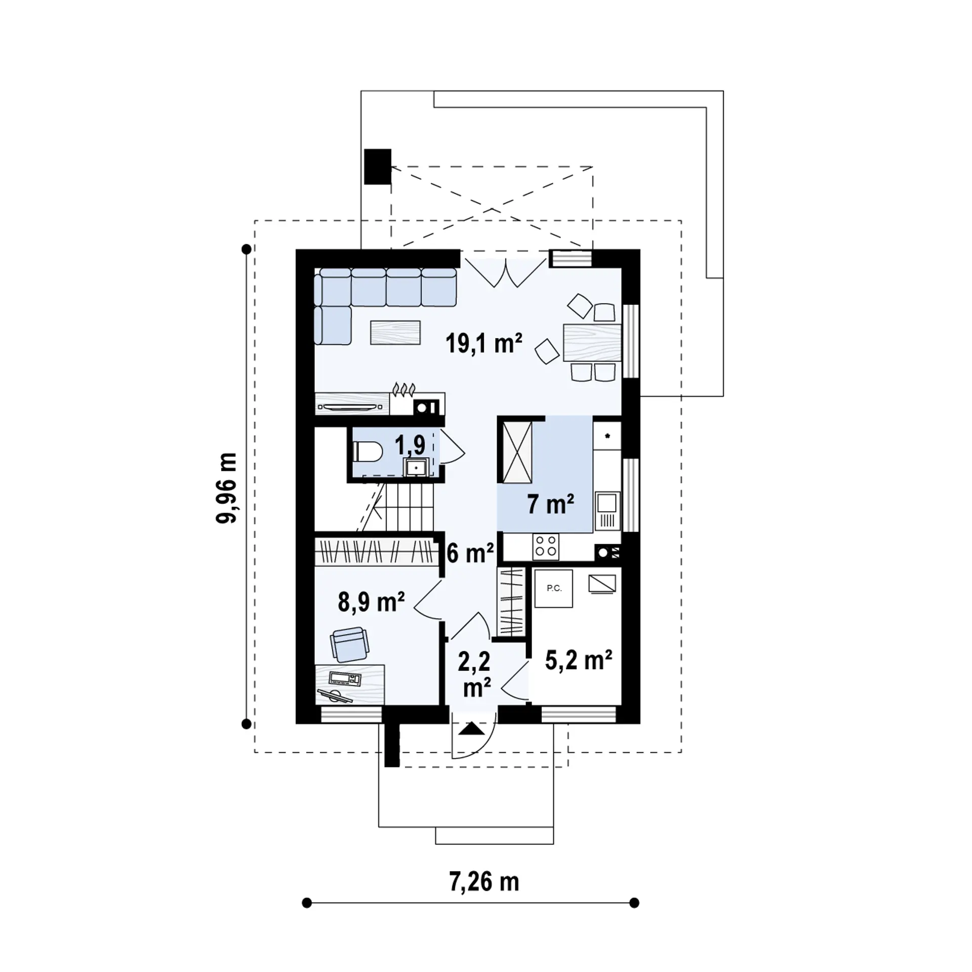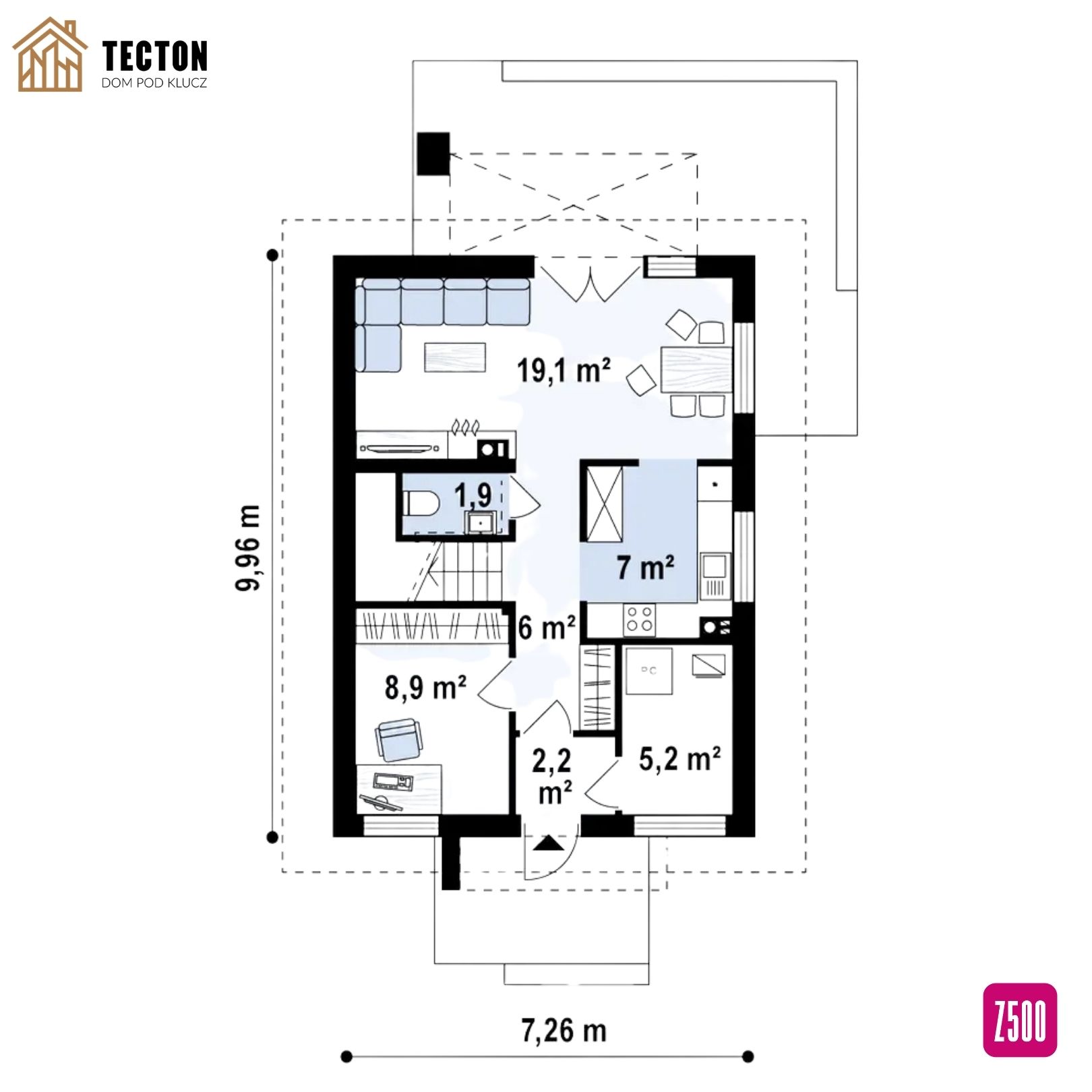 Dzięki kompaktowym wymiarom (powierzchnia użytkowa ok. 92 m², wysokość 7,69 m, kąt dachu 40°) dom idealnie nadaje się do zabudowy na działkach o szerokości już od 14 m. Pomimo niewielkiego metrażu zapewnia pełen komfort użytkowania dla rodziny 2+2 lub 2+3.