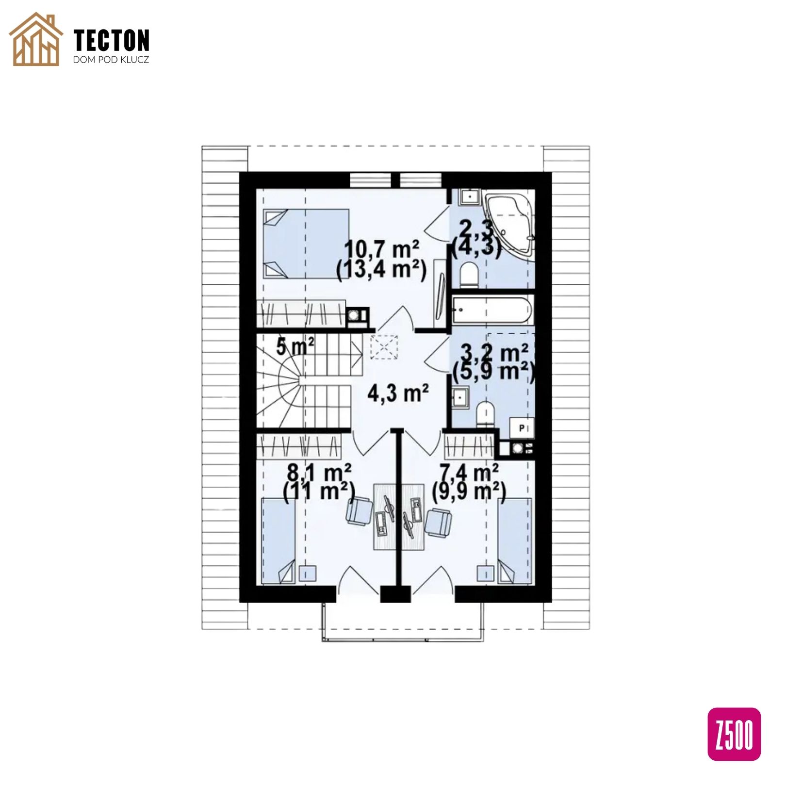 Na poddaszu użytkowym zaprojektowano trzy ustawne sypialnie – w tym główną z prywatną łazienką – oraz drugą, wspólną łazienkę dla domowników. Wszystkie pokoje są dobrze doświetlone i mają dostęp do balkonów, co zwiększa komfort mieszkańców.