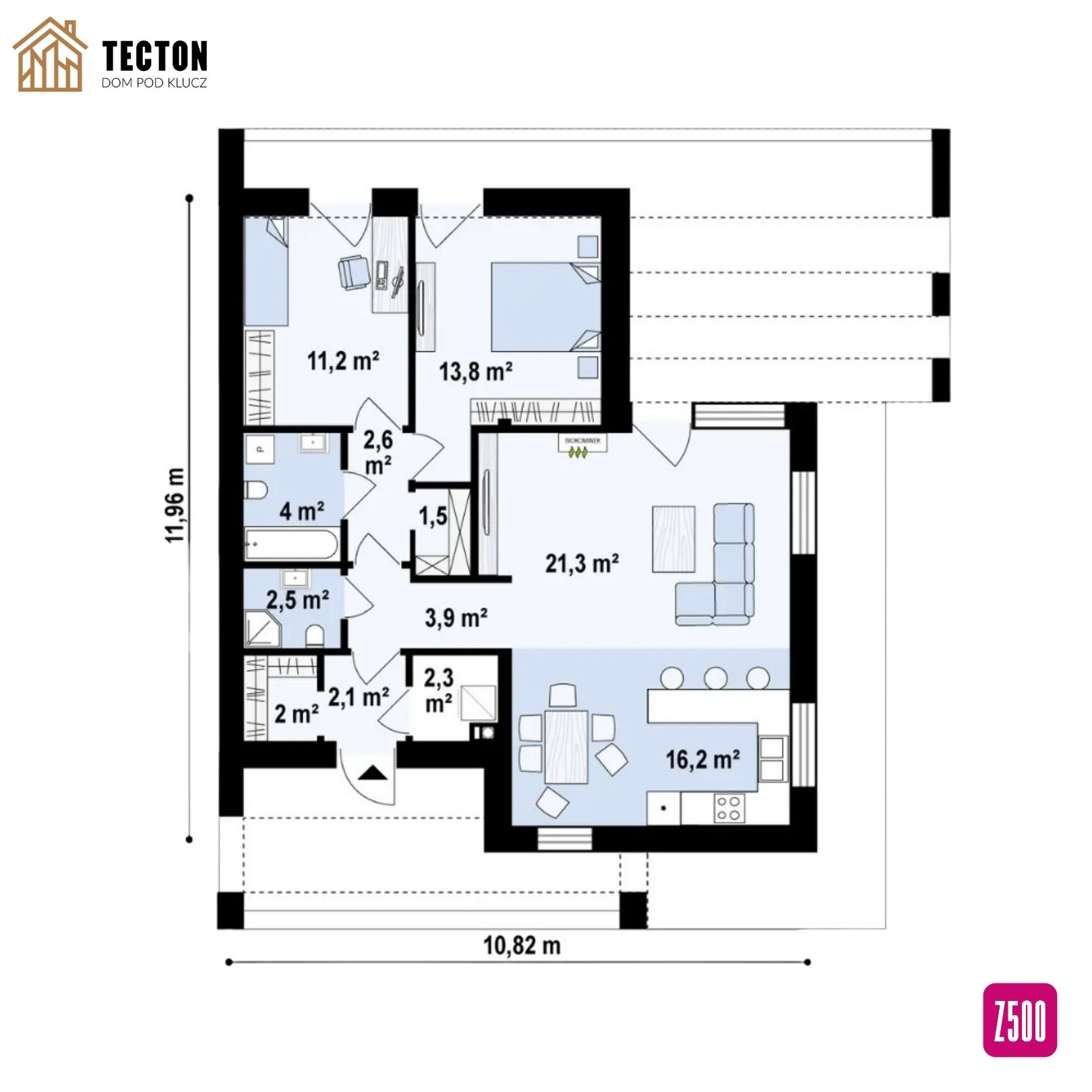Zx57 to nowoczesny, parterowy dom o powierzchni użytkowej 81,1 m², zaprojektowany z myślą o osobach ceniących minimalistyczną formę, funkcjonalny układ pomieszczeń i komfort użytkowania. Prosta, geometryczna bryła, duże przeszklenia oraz płaski dach nadają budynkowi wyjątkowo nowoczesny charakter, idealnie wpisujący się w aktualne trendy architektury mieszkaniowej.