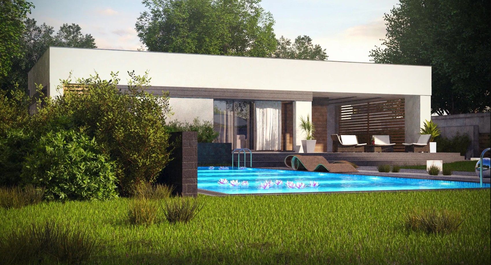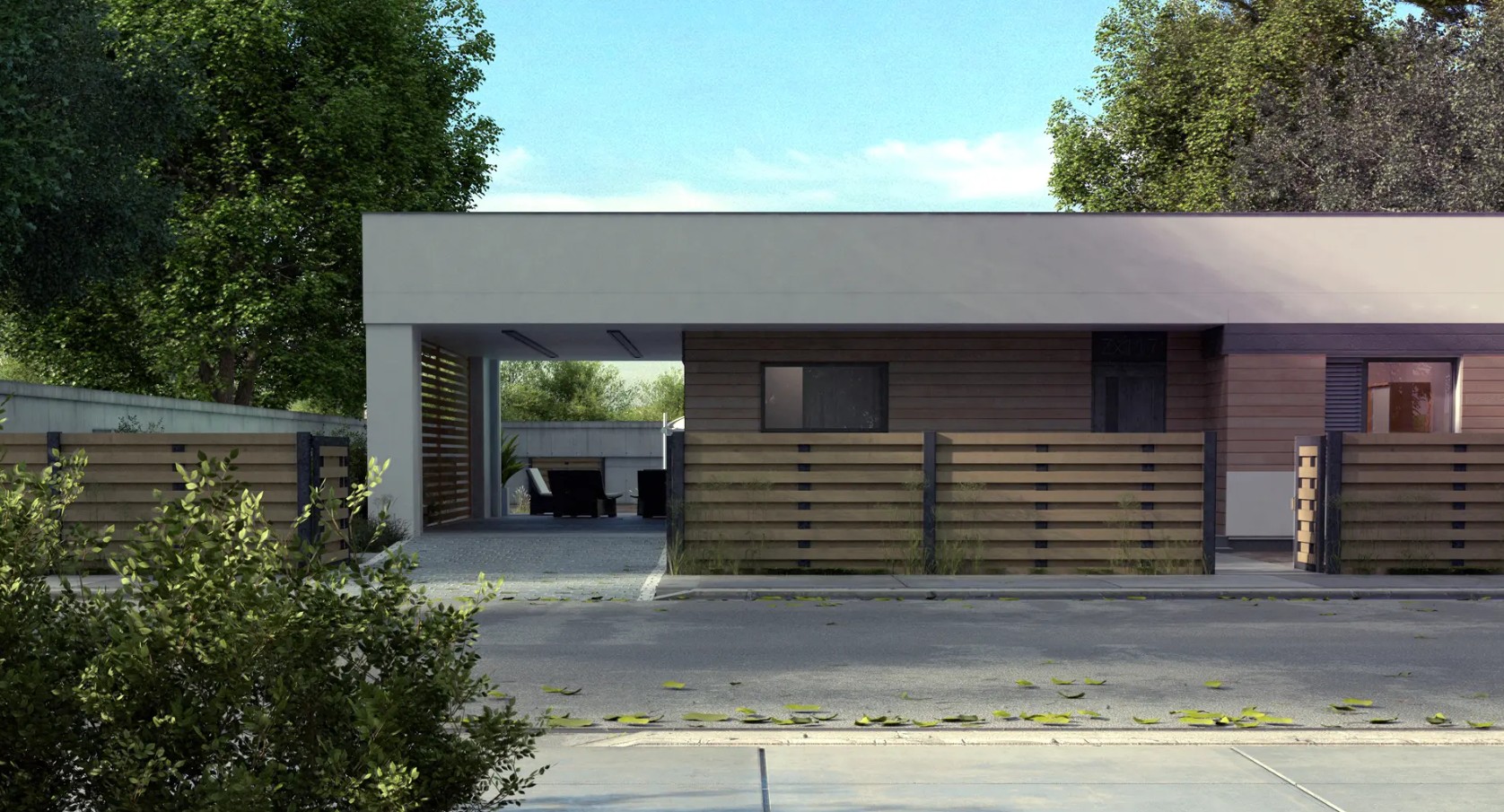 Projekt domu Zx117 to nowoczesny, parterowy dom jednorodzinny z płaskim dachem, zaprojektowany w duchu prostoty, harmonii i bliskości z naturą. Minimalistyczna bryła, elewacja częściowo wykończona drewnem oraz spokojna forma architektoniczna sprawiają, że dom doskonale wpisuje się zarówno w krajobraz podmiejski, jak i naturalne otoczenie.