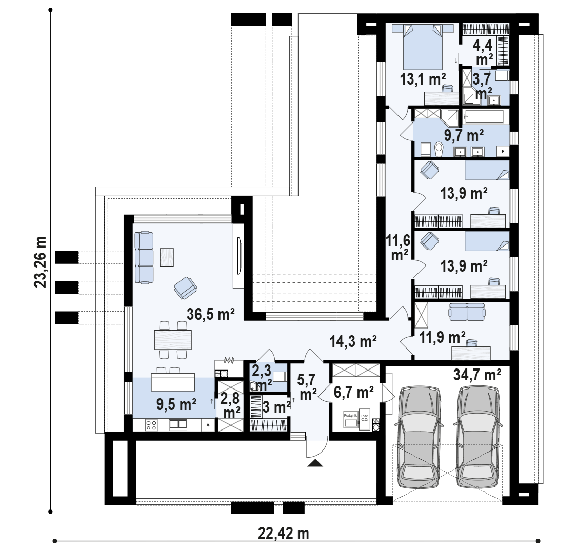 • garaż dwustanowiskowy (34,7 m²),