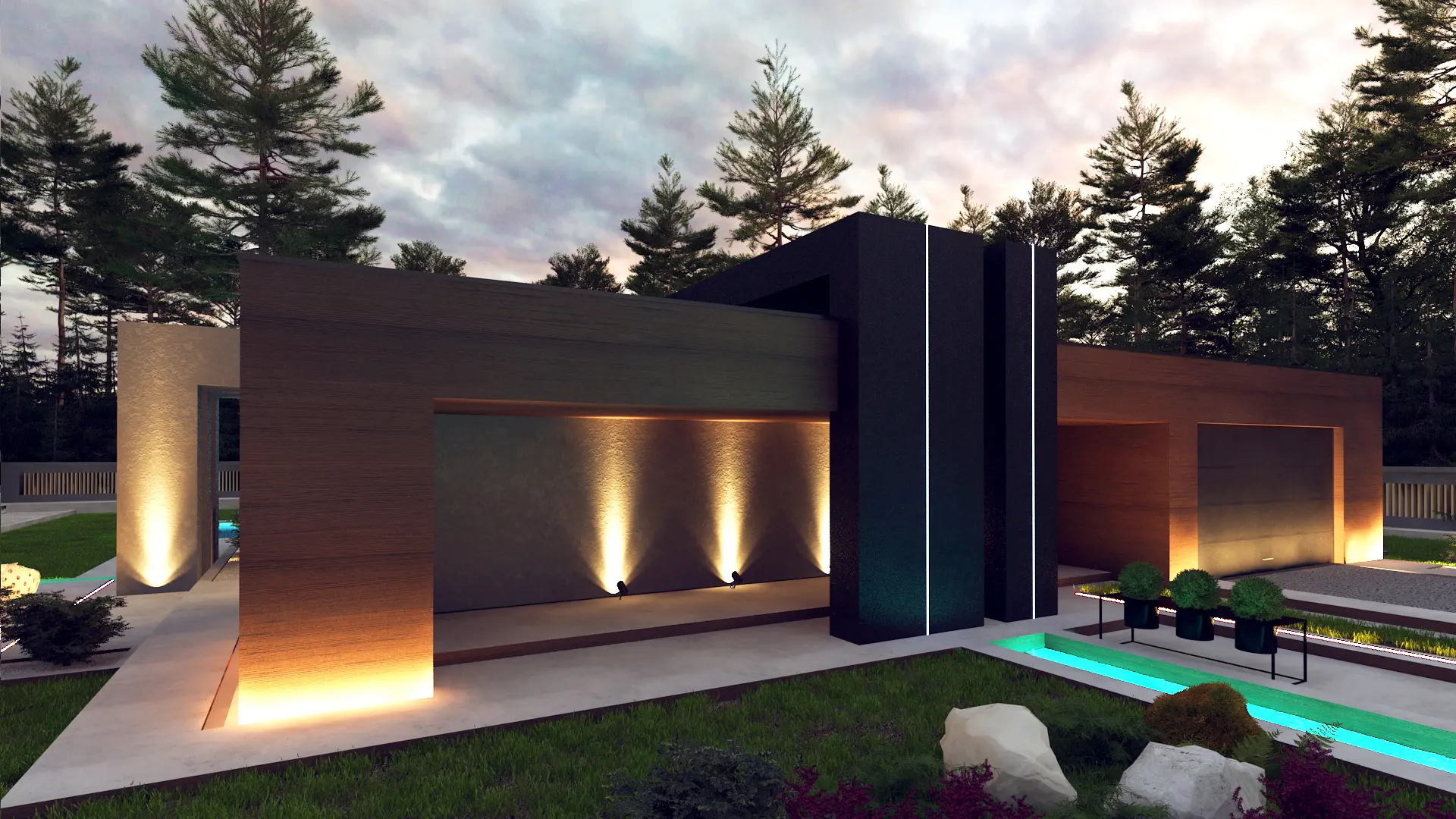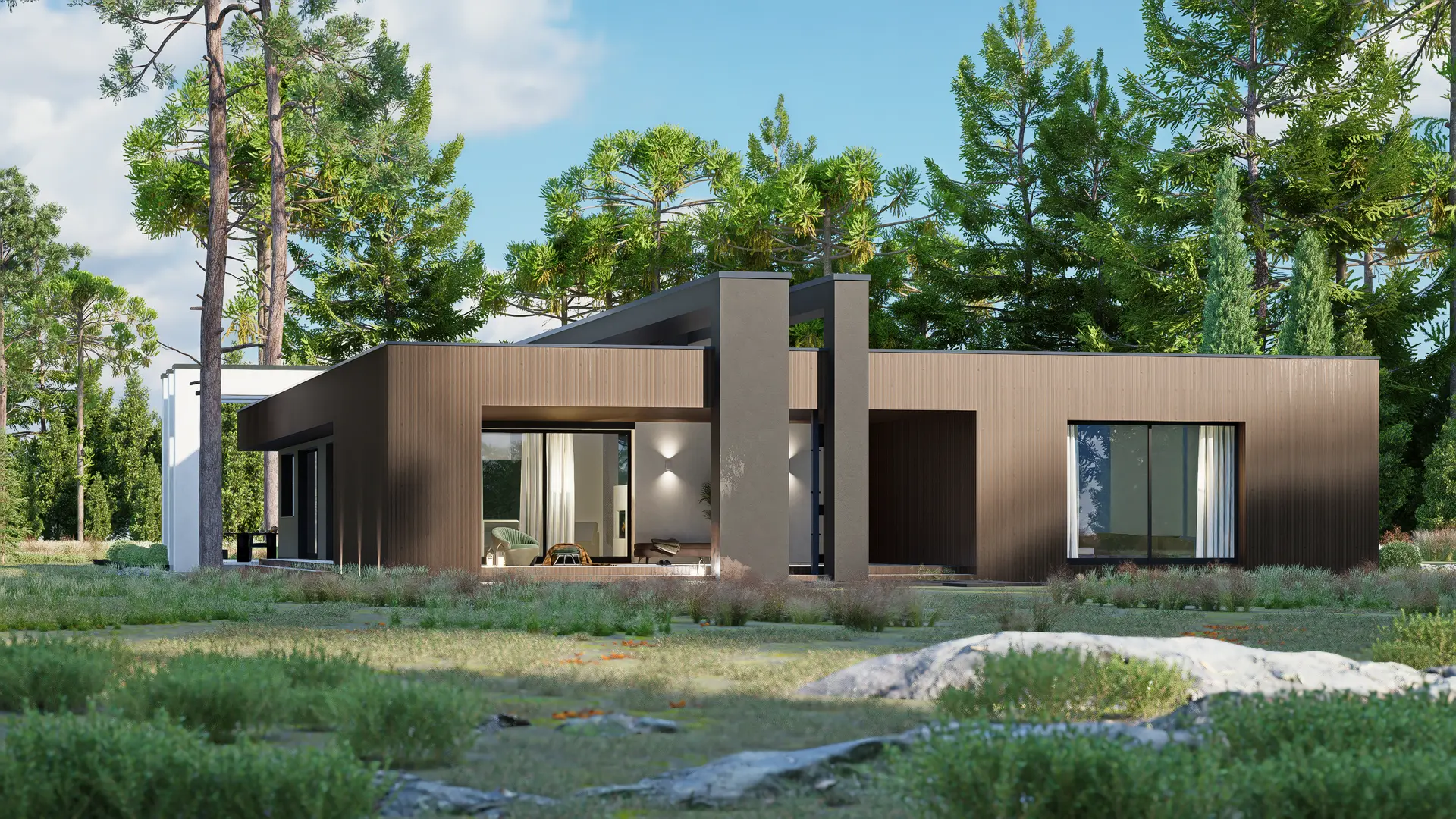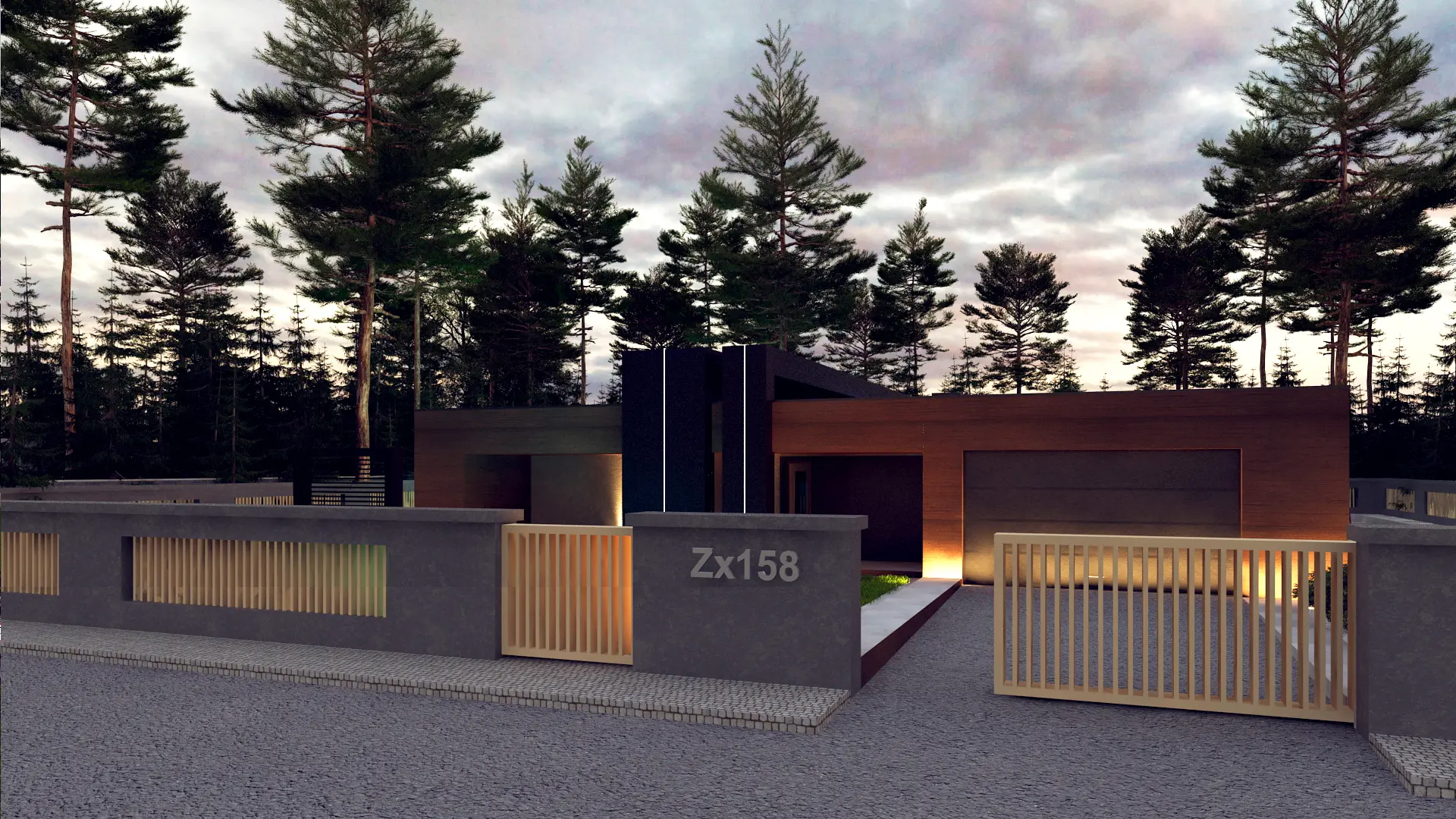 Zx158 to przykład nowoczesnego minimalizmu – prostokątna bryła, płaski dach i eleganckie materiały wykończeniowe (drewno, kamień, szkło).