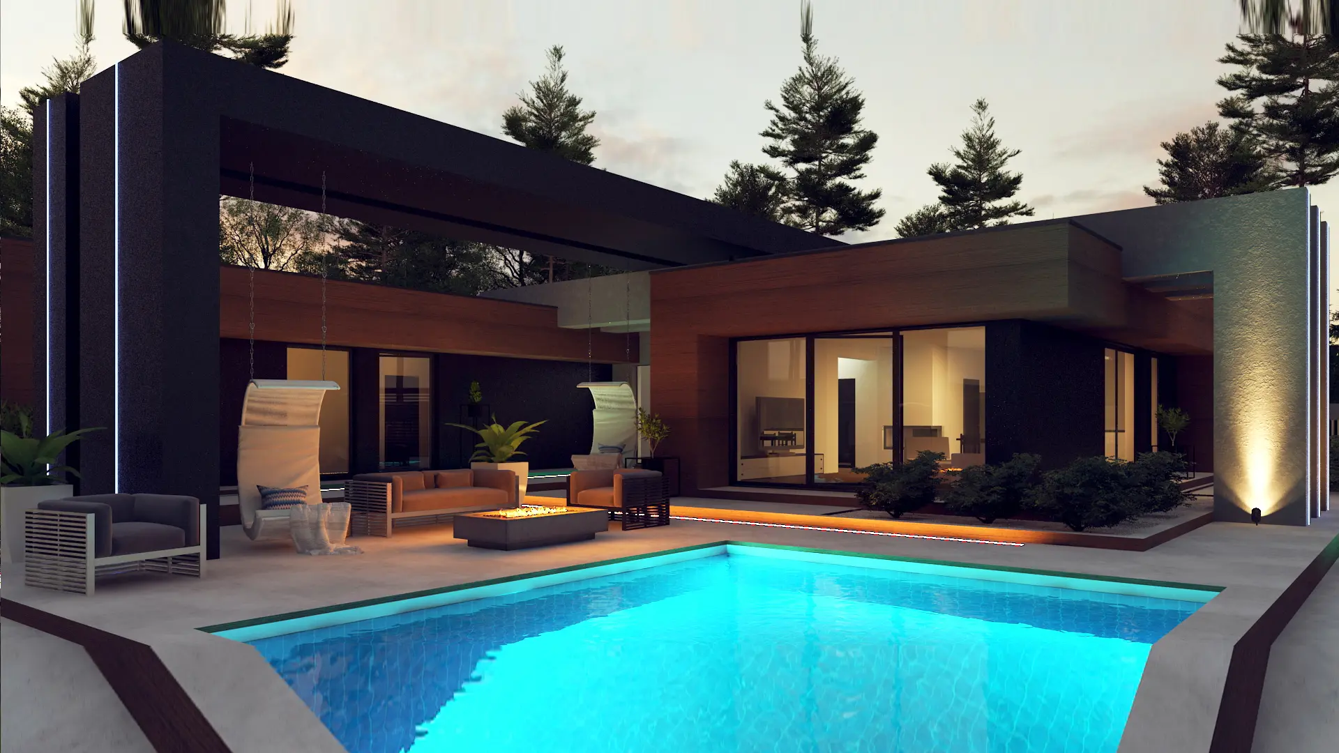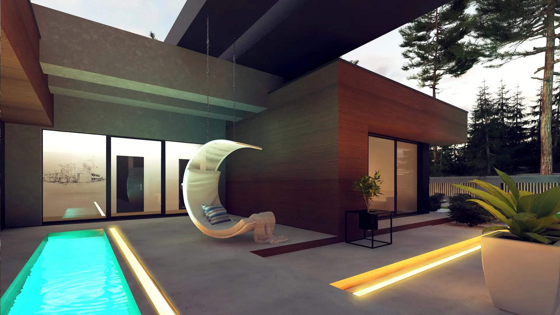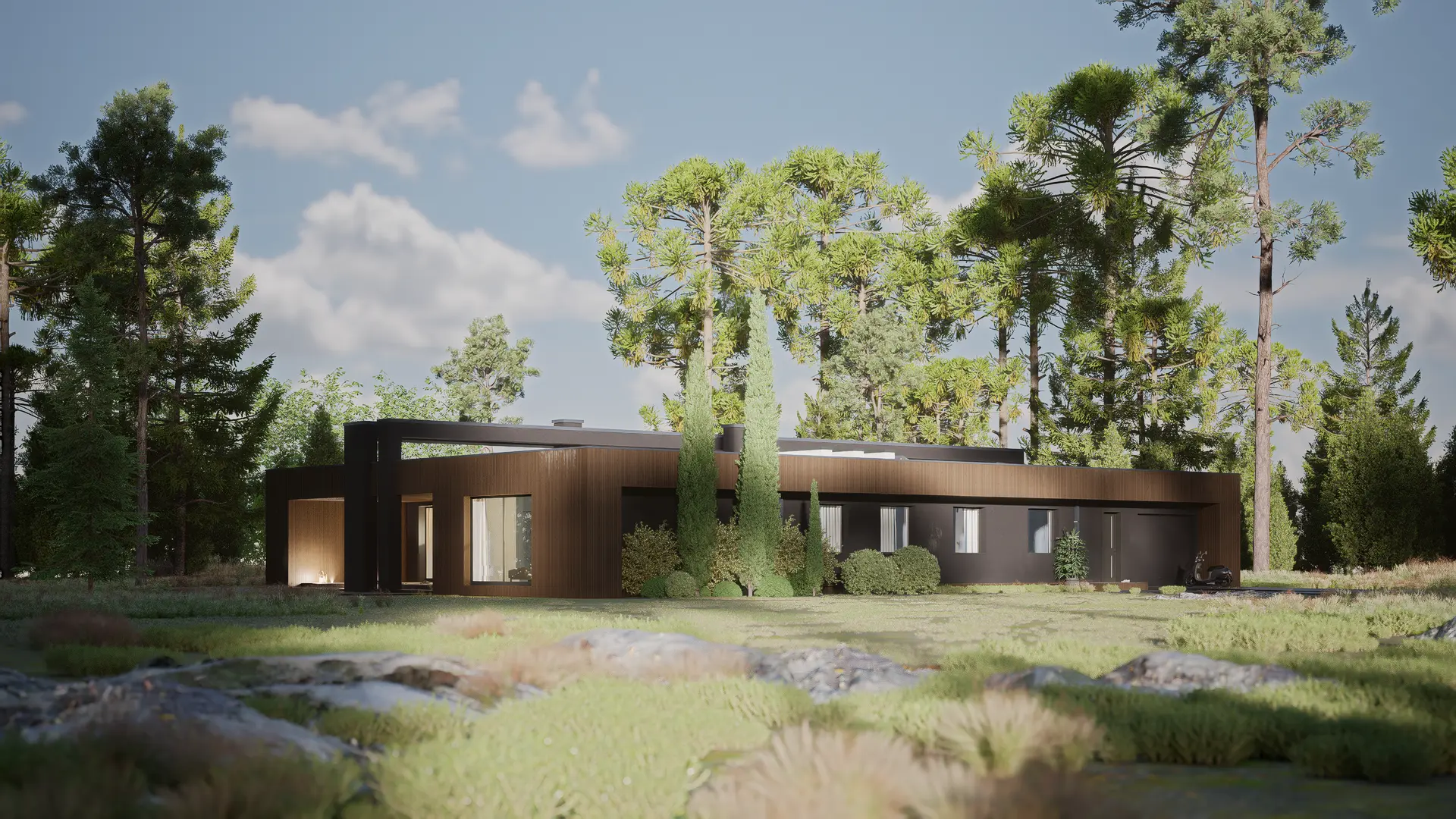 Zx158 to przykład nowoczesnego minimalizmu – prostokątna bryła, płaski dach i eleganckie materiały wykończeniowe (drewno, kamień, szkło).