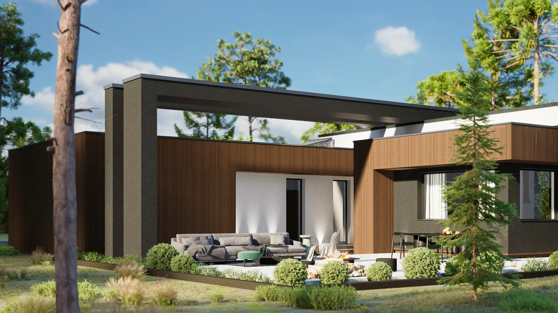 Ten dom łączy w sobie estetykę modernizmu i ciepło naturalnych materiałów, tworząc wyjątkowe miejsce do życia dla wymagających inwestorów.