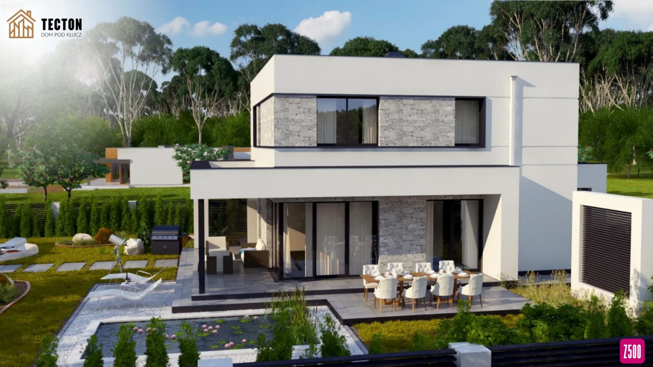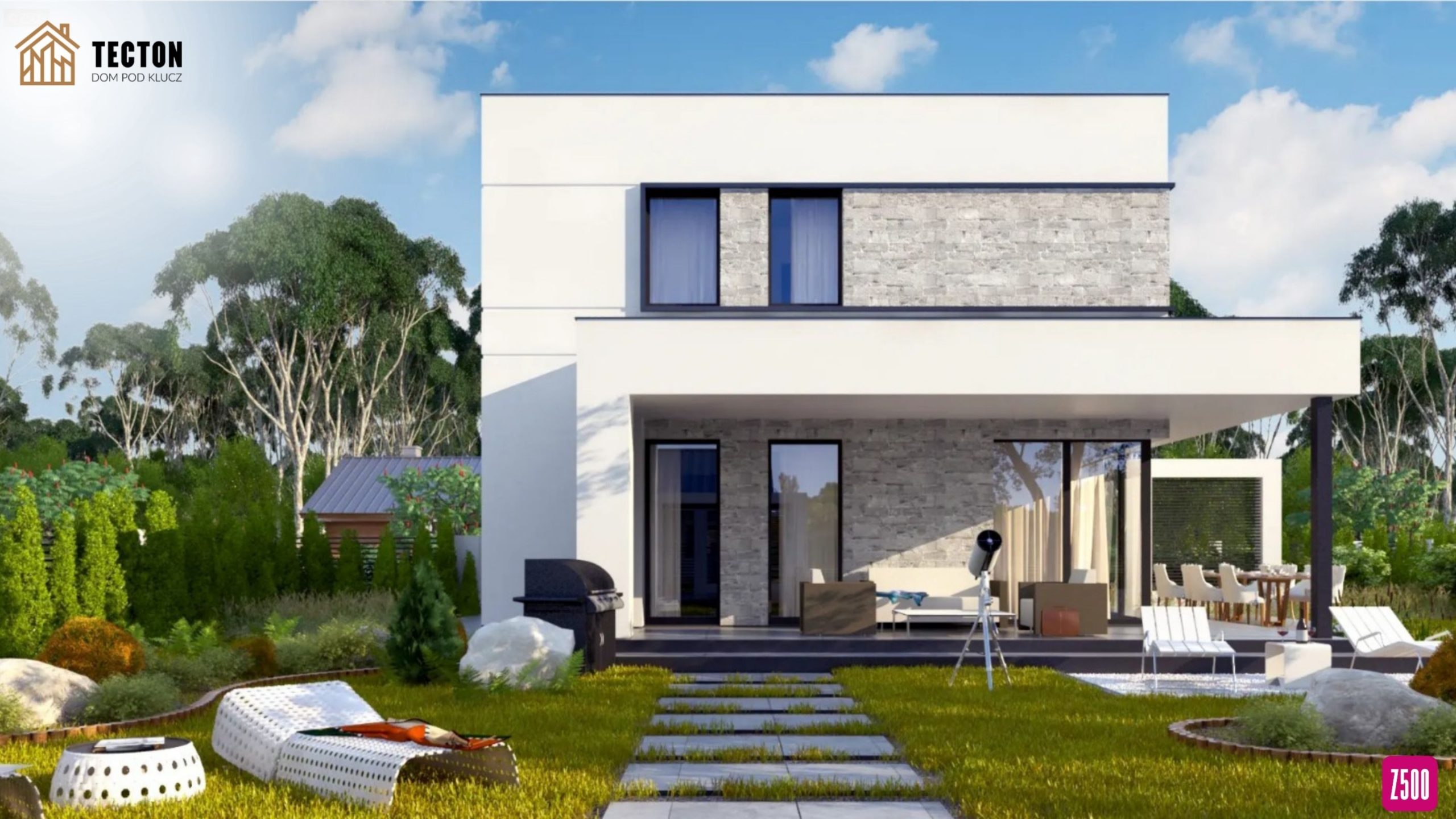 Duże przeszklenia sprawiają, że wnętrza są jasne i otwarte na ogród, co podkreśla kontakt mieszkańców z naturą.