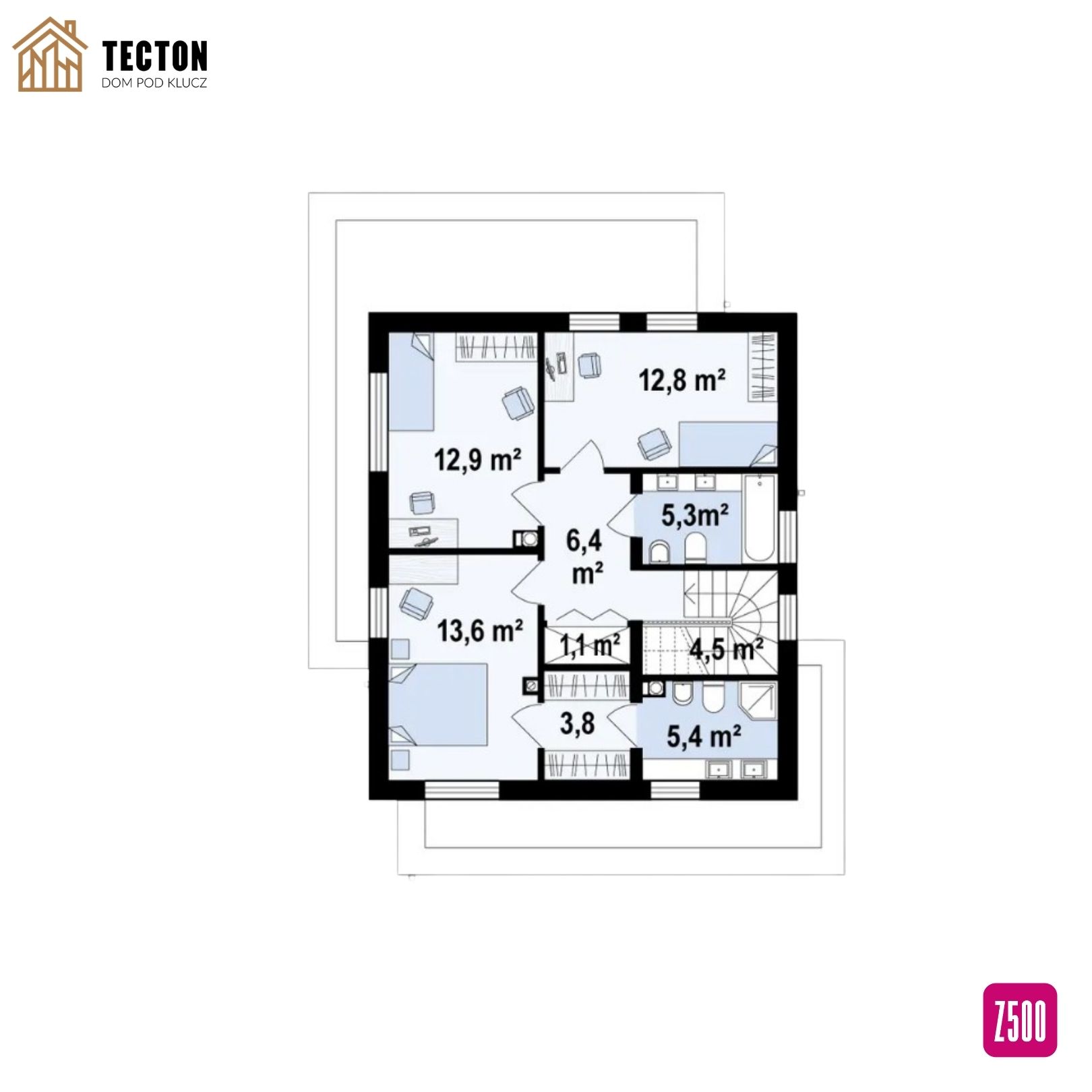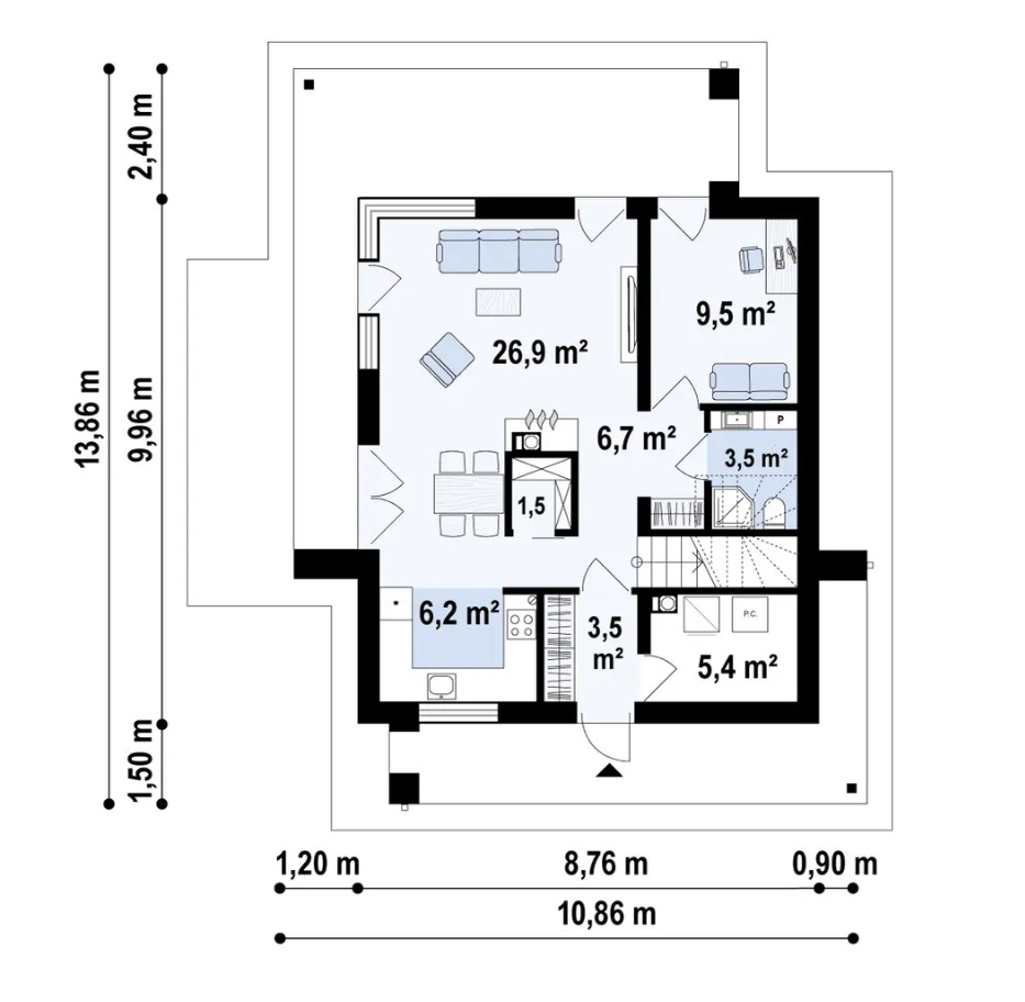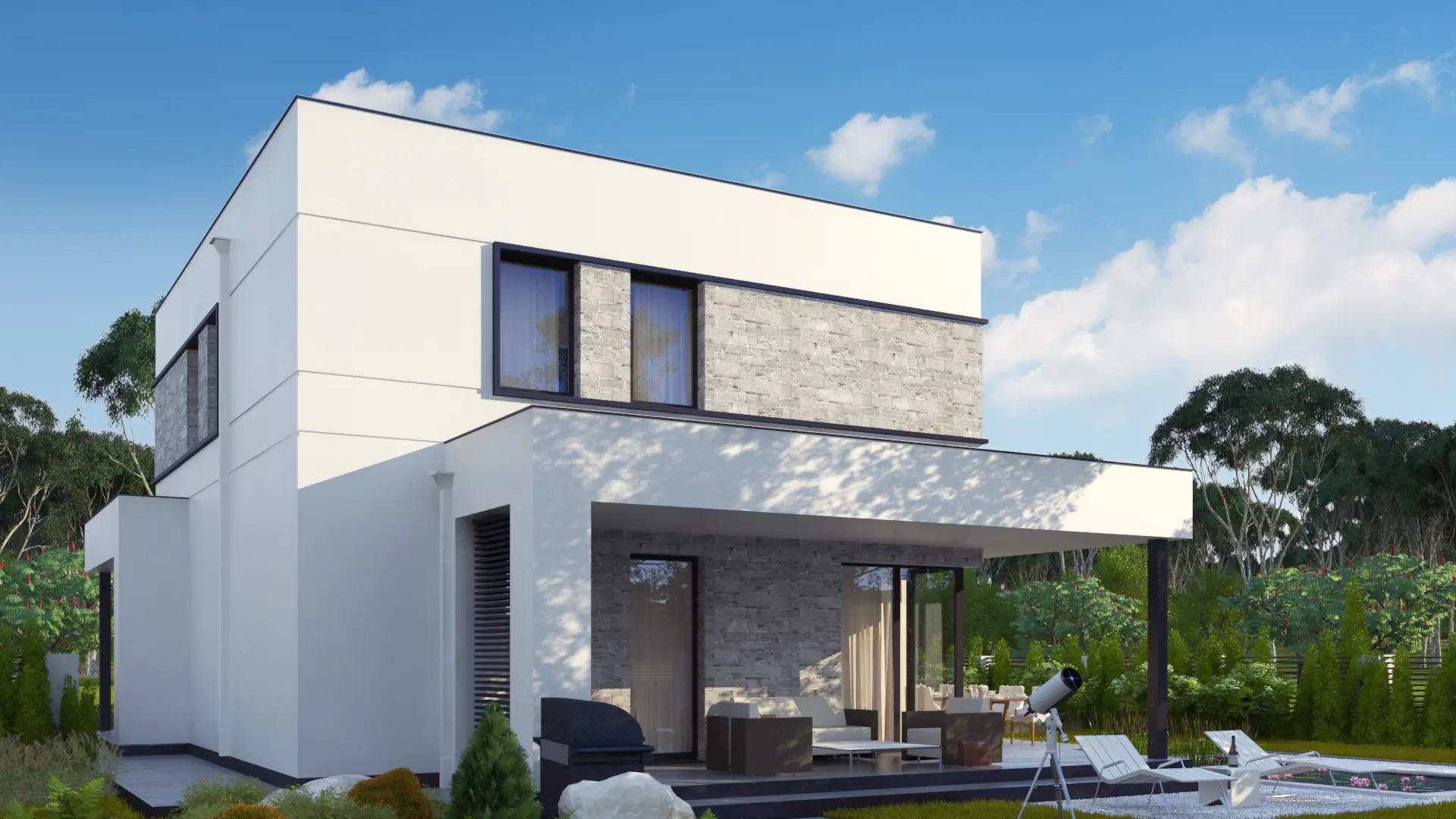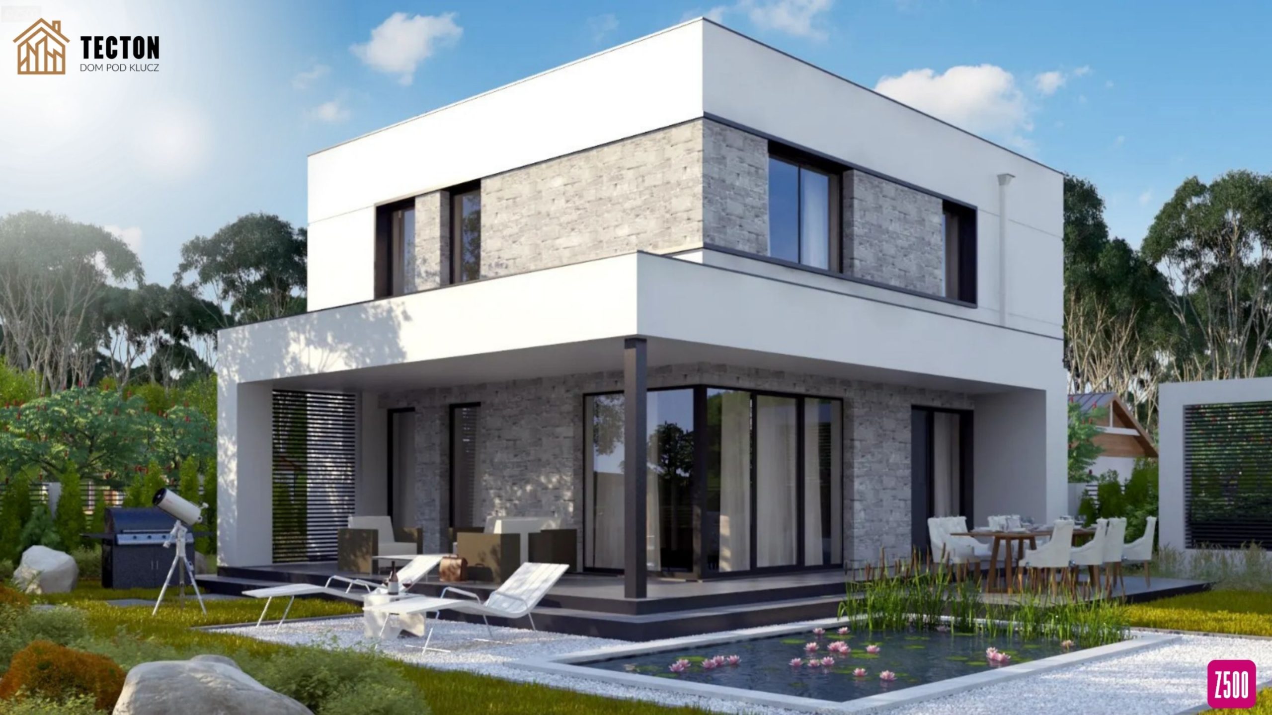 Ten projekt domu jednorodzinnego to propozycja dla osób ceniących nowoczesność, przestrzeń i funkcjonalność. Bryła budynku z płaskim dachem i surową kolorystyką elewacji nadaje mu minimalistyczny, elegancki charakter.Na parterze znajduje się salon połączony z jadalnią i kuchnią, z którego rozciąga się widok na ogród. W centralnej części zaplanowano kominek, który nadaje wnętrzu przytulności i tworzy wyjątkowy klimat. Dodatkowym atutem jest gabinet na parterze, idealny do pracy zdalnej lub jako dodatkowy pokój gościnny.Strefa prywatna obejmuje komfortową sypialnię z prywatną garderobą i łazienką, co zapewnia domownikom pełną wygodę i intymność. W domu przewidziano również WC dla gości oraz liczne miejsca na szafy wnękowe, ułatwiające utrzymanie porządku.
