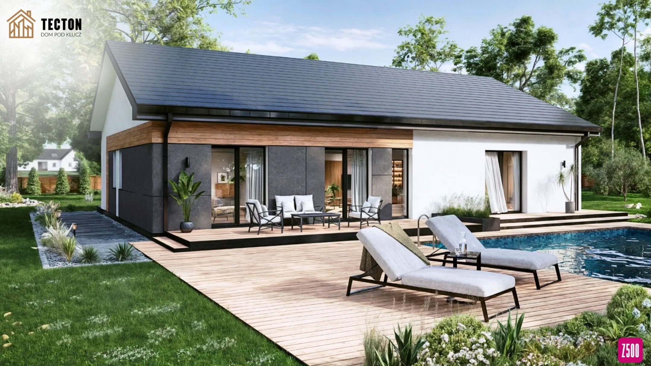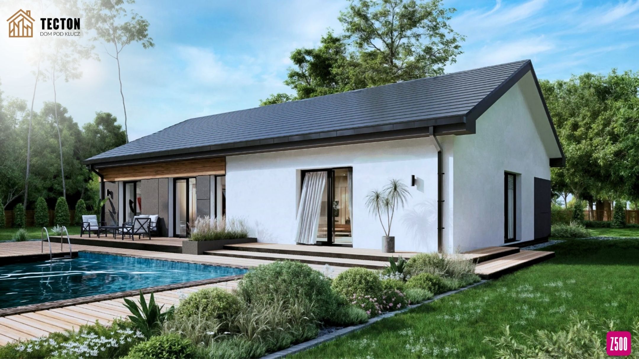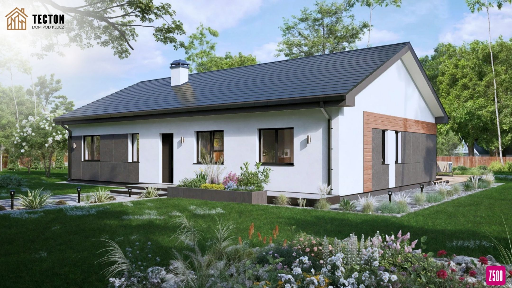 Projekt Z349 B to nowoczesny, przestronny dom parterowy o powierzchni 149,3 m², będący powiększoną i uproszczoną wersją popularnego modelu Z349. Prosta bryła oraz dach dwuspadowy zapewniają ekonomiczną budowę, a minimalistyczna elewacja w odcieniach bieli i grafitu nadaje budynkowi elegancki, ponadczasowy charakter.