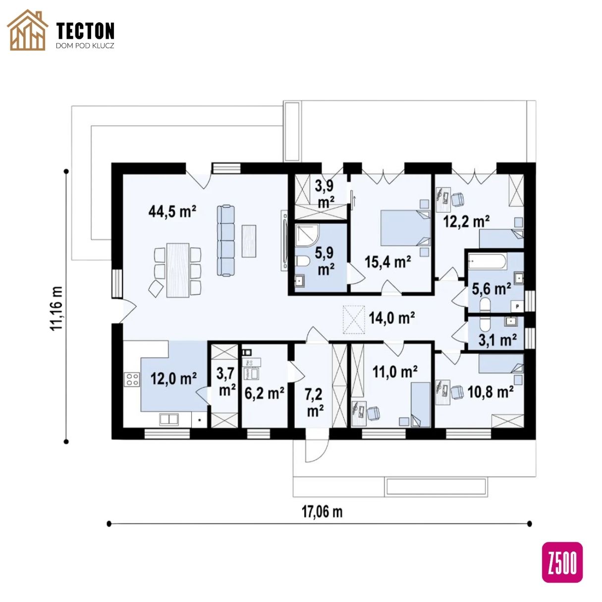 Projekt Z349 B to idealna propozycja dla osób, które szukają funkcjonalnego domu parterowego z dużą liczbą pokoi w nowoczesnym stylu.