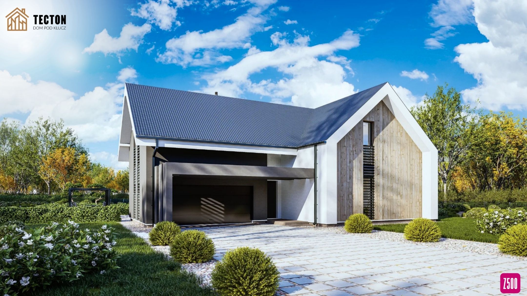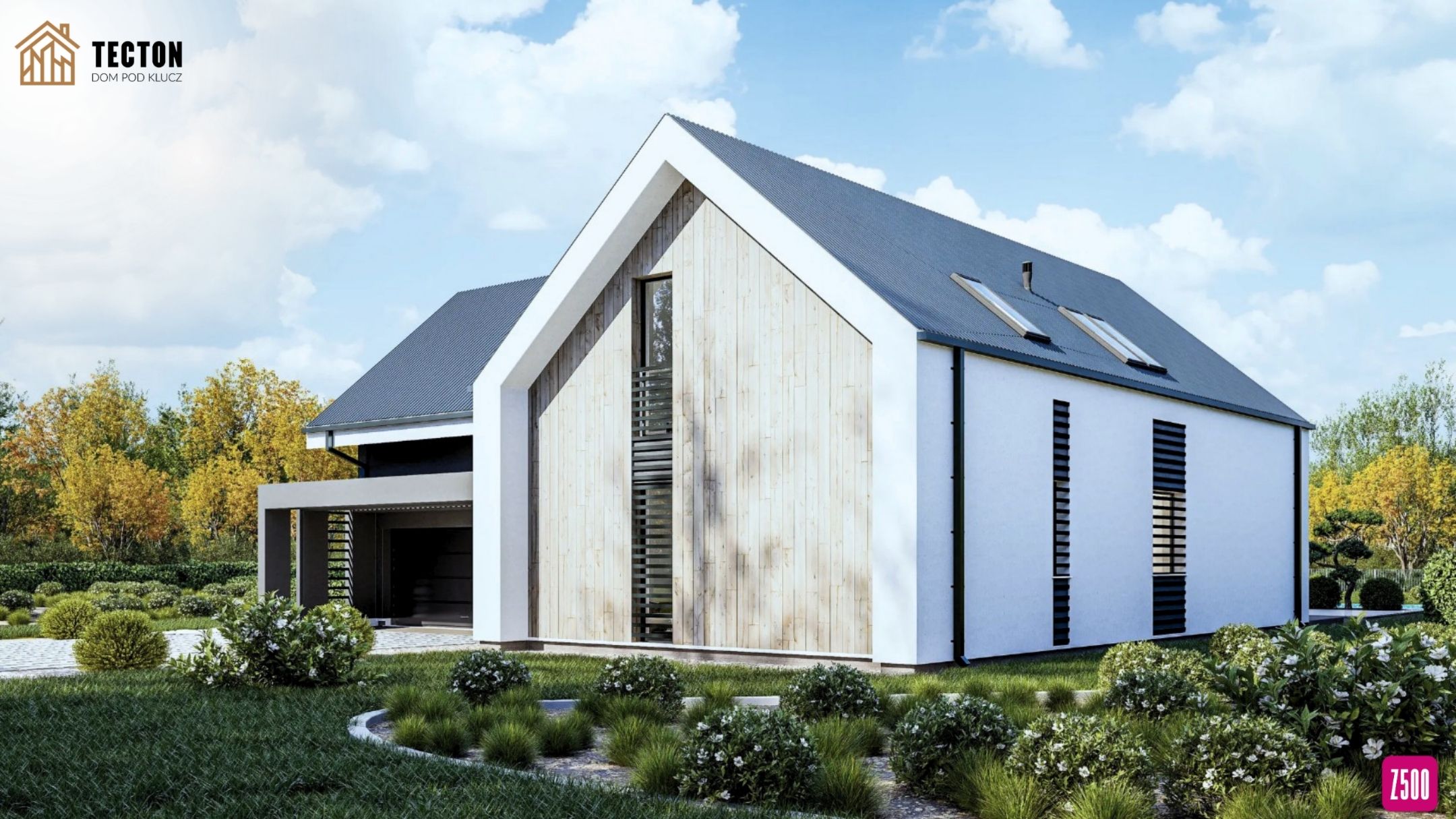 Projekt Z357 to przestronny, nowoczesny dom z poddaszem użytkowym, antresolą i garażem dwustanowiskowym, idealny dla wymagających inwestorów. Bryła w stylu nowoczesnej stodoły oraz dach dwuspadowy nadają budynkowi elegancki i ponadczasowy charakter, a układ na planie litery T zapewnia funkcjonalne rozdzielenie stref.
