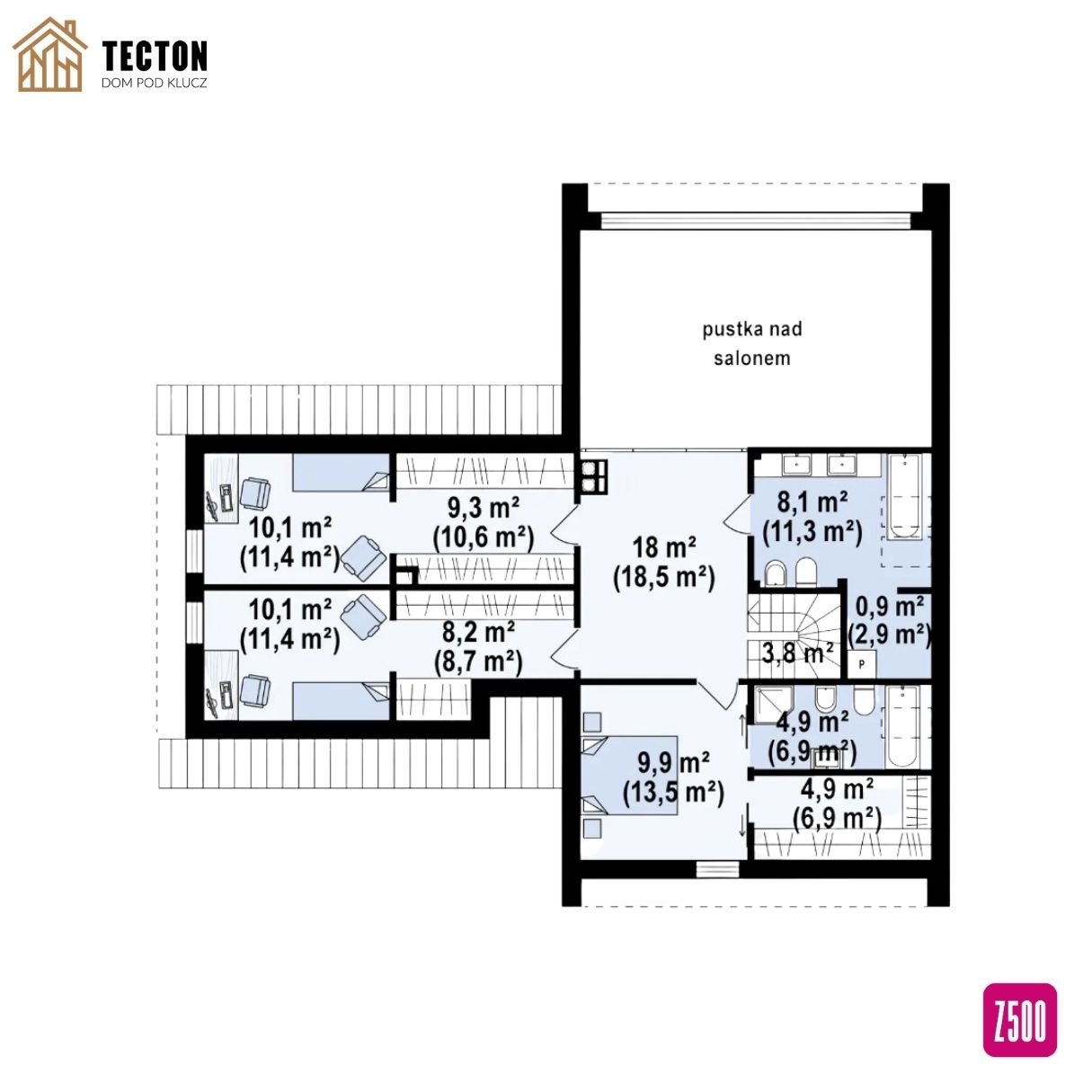 Sercem domu jest imponujący salon z antresolą i dużymi przeszkleniami, które doskonale doświetlają wnętrze i otwierają je na ogród. Na parterze znajduje się także dodatkowy pokój z prywatną łazienką i garderobą – idealny jako sypialnia, gabinet lub pokój gościnny. Poddasze to komfortowa strefa nocna z trzema sypialniami, w tym główną z własną łazienką i garderobą.